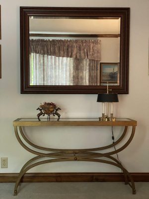 Butler Console Table and Wall Hanging Mirror, 2-England Furniture Matching Recliners, Hollywood Regency Iron Curule X-Frame Glass Top Console/Sofa Table, Oval Oak Trestle Style Dining Table w/4- Chairs. Bassett Marble Top Vanity w/Mirror, Bombay Upholstered Chair, 2-Tile Top Nightstands, Dark Cherry Jewelry Armoire, Bombay Round Marble Top Coffee Table, Bombay End Tables, Queen Size Mahogany Pier Bed w/Lighted Mirror and Headboard Storage, Crop-Kills Co. - Ladies Drop Front Writing Desk, Dropleaf Maple Kitchen Table w/4-Chairs, Table and Floor Lamps, Sectional Sofa, Vintage Sewing Caddy, ORR Holland Tulip Wool Blanket, Crystal, Lenox China, Crystal Vanity Boudoir Lamps, Pablo Sanquino Bowl, Quimper Fiaince Folk Art Bowl, Royal Doulton Toby Jugs, Sailors Nautical Knot Shadow Box, Lighthouse & Nautical Artwork, Oil Paintings, Prints, David Carter Brown Sailing Boats Print.